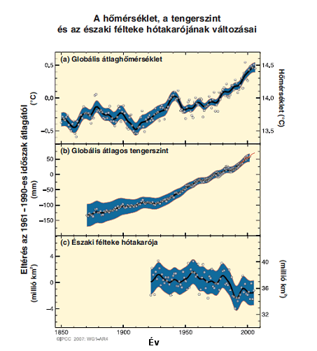 Megfigyelt változások a globális átlaghőmérsékletben, a globálisan átlagolt tengerszintben az árapály-mércék (kék), illetve a műholdas (piros) adatok alapján, valamint az északi félteke hótakarójában a március-áprilisi időszakban. A simított görbék az évtizedes átlagokat, a körök az évtizedenkénti átlagolt értékeket mutatják. Minden változás az 1961-1990 évek átlagaihoz viszonyított eltérés. Az árnyékolt területek a bizonytalansági tartományokat mutatják. (Forrás: IPCC WG-I, 2007)