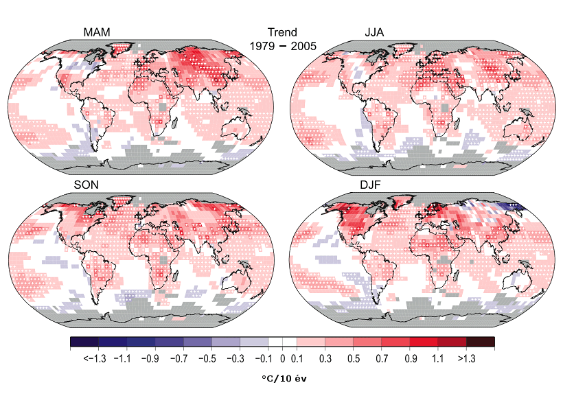 a felszíni léghőmérséklet lineáris trendjei (oC/10 év) tavasztól télig, a hónapok kezdőbetűi szerint. Az 5%-os szinten szignifikáns trendeket a + jel emeli ki. (Forrás: IPCC 2007: 3.10 ábra)