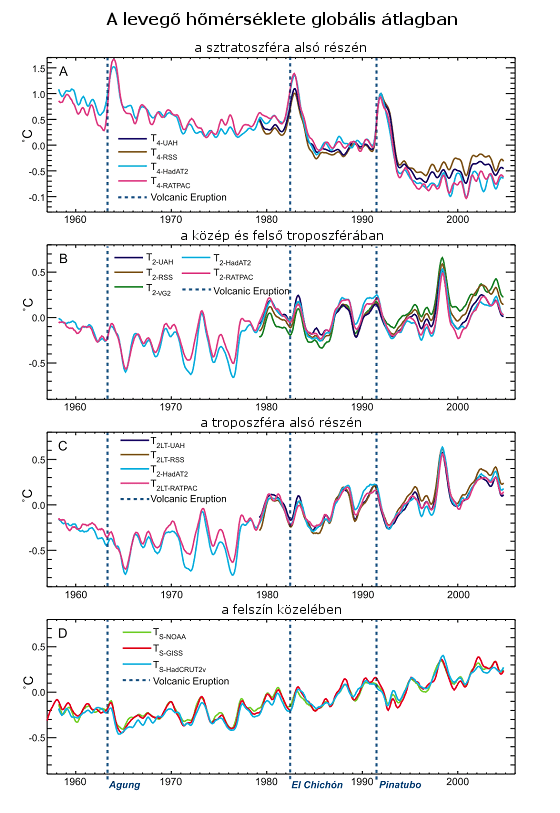 a levegő hőmérséklete globális átlagban (A-D sorrendben) a sztratoszférában, a felső troposzférában, az alsó troposzférában és a felszín közelében. A két felső réteg műholdakról történő mikrohullámú szondázás eredménye, a harmadik műholdas és rádiószondás méréseken, míg a legalsó szint alakulása a felszíni méréseken alapszik. Minden eltérés az 1979-1997 évek átlagához viszonyított érték. A sztratoszféra azért hűl, mert hiányzik az energiamérlegéből az üvegház-gázok által elnyert energia, és a melegedés is magasabbra emeli a tropopauzát. (Forrás: IPCC, 2007: 3.17 ábra)