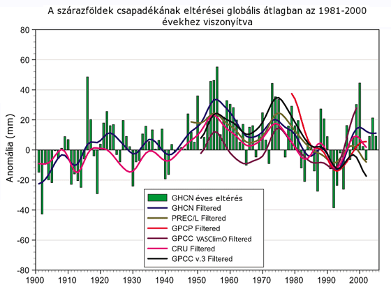 a szárazföldek csapadékának eltérései az 1900-2005 évek között globális átlagban az 1981-2000 évekhez viszonyítva, különböző szerzők rekonstrukciója alapján. A sima görbék évtizedes mozgó átlagok. Az eltérések fő oka, hogy a csapadék térben is meglehetősen szeszélyes eloszlású. Emiatt a felhasznált állomáshálózat eltérései befolyásolják az eredményt. (Forrás: IPCC 2007: 3.10 ábra)