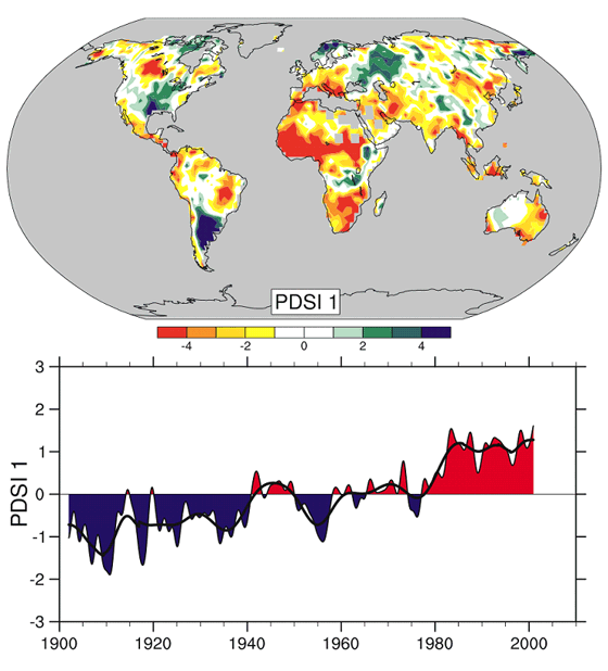 A Palmer-féle Aszályindex (PDSI) alakulása 1900 és 2002 között a kontinenseken (felső ábra). A piros és narancssárga szín a talaj felső rétegeinek szárazabbá válását, a zöld és a kék pedig nedvesebbé válását jelzi. A globális átlag (alsó ábra) egyértelmű szárazabbá válást mutat, főként azért, mert a hőmérséklet emelkedése mindenütt fokozza a párolgást.