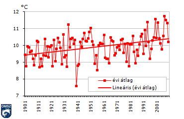 Az országos évi középhőmérsékletek 1901 és 2010 között