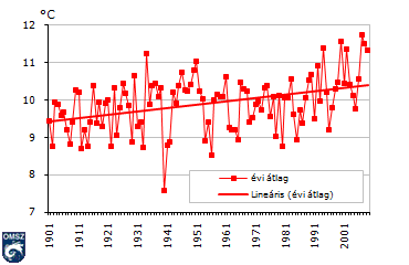 Az országos évi középhõmérsékletek 1901 és 2009 között
