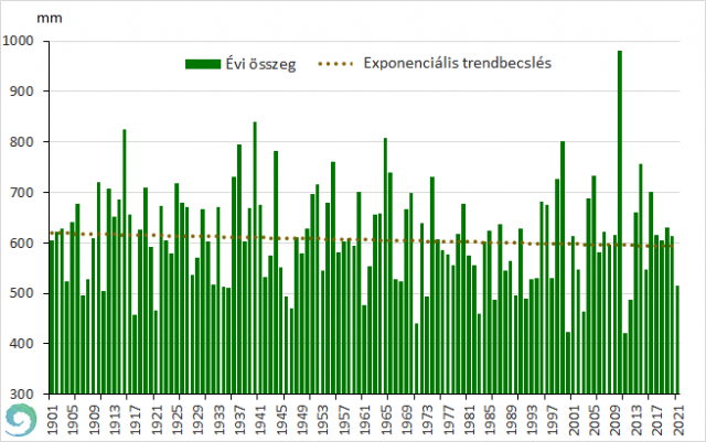 Az év során lehullott csapadék mennyisége országos átlagban a homogenizált adatok alapján 514 mm, ezzel a 20. legszárazabb év volt 1901 óta. 2021 során a megszokott csapadékmennyiség 83%-a hullott le, mind térben, mind időben igen szélsőségesen alakult az eloszlása. A március és június nagyon aszályos volt, de szeptemberben és októberben is jelentősen elmaradt az 1991-2020-as normálértéktől. Az elmúlt 121 évben, 1901 és 2021 között az évi csapadékösszegekhez illesztett exponenciális trend alapján mérsékelt, átlagosan 3,4%-os csökkenést tapasztaltunk, a csapadék csökkenése statisztikailag nem szignifikáns (2. ábra). A változás az ország különböző pontjain -16% és +8% között alakul, az északnyugati tájakon 10‑16%-os csökkenést, az Alföld északi részén kisebb területen 4-6%-os növekedést kapunk.