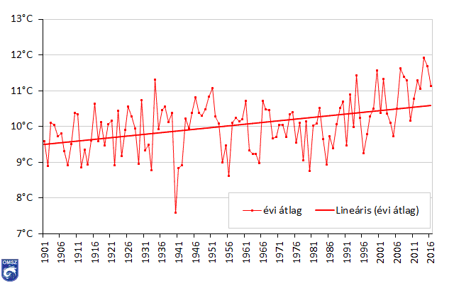 Az országos évi középhőmérséklet adatokhoz illesztett lineáris trend (1. ábra) egyértelmű emelkedést mutat. Az évi középhőmérséklet változása az elmúlt 116 évben +1,10 °C-nak, az elmúlt 30 évre vonatkozóan pedig +1,38 °C-nak adódik.
