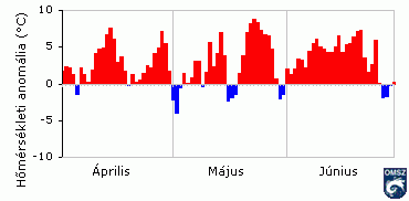 szintén melegebb volt a sokévi átlagnál, országosan 2,4 fokkal. A pozitív anomália az ország déli, délkeleti régióiban volt kisebb (ott a normálnál csak 1-2 fokkal volt magasabb a havi középhõmérséklet), a legnagyobb eltérést (az átlagnál közel 4 fokkal melegebb áprilisi középhõmérsékletet) a nyugati országrészben regisztráltak. A meleg, napos idõ kedvezett a gyümölcsök fejlõdésének, ezért okozott milliárdos kárt április végén (majd május elején) néhány fagyos éjszaka.