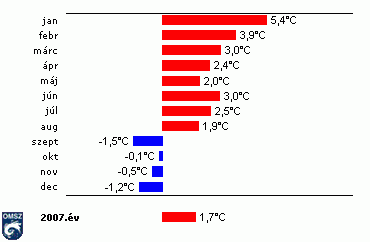 Az országos havi középhõmérséklet eltérése a sokévi (1971-2000-es) átlagtól 2007-ben (16 állomás homogenizált, interpolált adatai alapján)