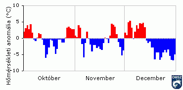 sem törte meg a szeptember óta tartó tendenciát: országos átlagban mintegy 3,0 fokkal melegebb volt, mint az ilyenkor szokásos. Az ország nyugati felében volt kisebb (2-3- fokos) a pozitív anomália, az északkeleti országrészben helyenként 4 fokkal is melegebb volt a normálnál. Fagyos nap szórványosan még elõfordult, legtöbb (20) fagyos napot az Északi-középhegységben regisztráltak.