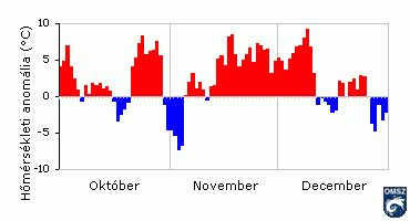 az õsz másik két hónapjához hasonlóan melegebb volt az ilyenkor szokásosnál, országos átlagban mindegy 2,4 fokkal. Országon belül ezzel együtt voltak eltérések: míg a déli és keleti országrészekben helyenként csak 1,5-2 fokos volt az anomália, addig az ország nyugati csücskében az átlagtól való eltérés esetenként meghaladta a 3 fokot is.
