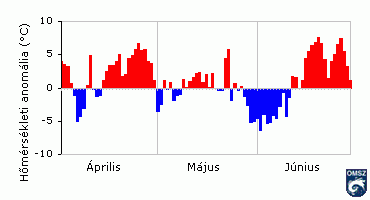 másfél fokkal melegebb volt a szokásosnál, középhõmérséklete országos átlagban 11,9 foknak adódott. A hónap elsõ felében még sûrûn váltogatták egymást a normálnál melegebb és hidegebb idõszakok (áprilisban mindössze 7 nap középhõmérséklete maradt el a sokévi átlagtól), 14-tõl kezdve aztán egészen a hónap végéig kellemes, késõ tavaszias, az átlagnál esetenként 5-7 fokkal melegebb idõben volt részünk.