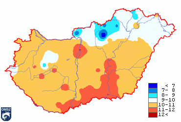2006-ban az országos évi középhõmérséklet 10,3 °C volt, ami 0,6°C-kal meghaladta az 1961-90-es 30 éves átlagot. Az országon belül 6,2°C és 12,2°C között alakultak az évi középhõmérséklet értékek (8. ábra).