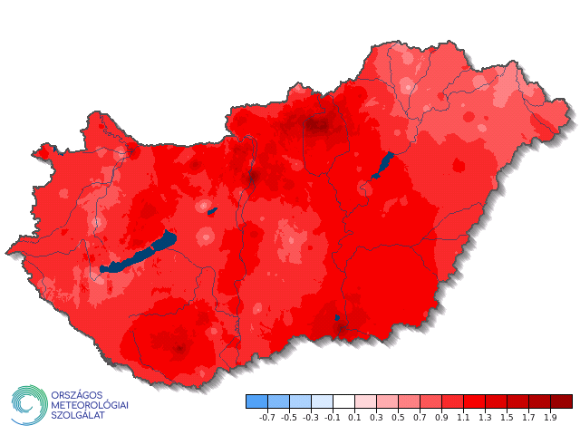 A 9. ábra az évi középhőmérséklet eltérésének területi eloszlását mutatja az 1991-2020-as éghajlati normálhoz viszonyítva. Az országon belül 0,5-2,0 °C közötti anomáliák adódtak. A legalacsonyabb értékek foltokban rajzolódtak ki, ezen kívül Északkelet-Magyarországon jelentkezett nagyobb területen az átlagosnál kisebb, 0,5-0,9 °C közötti pozitív eltérés. A legnagyobb pozitív anomáliát a Mecsek és a Mátra térségében, továbbá Szeged és Budapest környékén kaptuk (>1,8°C).
