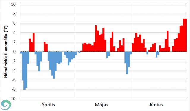 Június kétharmadában a sokévi átlag felett alakult a napi középhőmérséklet. A hűvös május 29- ét követő melegedés június első napjaiban is folytatódott. Kisebb ingadozás volt jellemző június 3. és 7. között, majd a hazánk felett átvonuló hidegfrontok és zivatarzónák miatt jelentősebb eltérések adódtak. Egy ilyen hidegfront hatására a hónap közepén a normál érték alá süllyedt az átlaghőmérséklet. Ezt követően intenzív melegedés következett, melynek hatására 20-án már 4,5 °C-kal melegebb volt a szokásosnál (25 °C). Egy kisebb mértékű enyhülést követően (22- én a sokéves átlaggal megegyező volt a hőmérséklet) a hónap végéig egyértelmű melegedés volt tapasztalható. Ekkor hazánk időjárását egy anticiklon határozta meg. Olyannyira megemelkedett a napi középhőmérséklet, hogy 27-től egy egyhetes hőhullám kezdődött. 28-tól egy meleg nedves szállítószalagnak köszönhetően dél felől még az addiginál is melegebb légtömegek érkeztek a Kárpát-medence fölé. A gyenge hidegfront és a csapadéka nem hozott felfrissülést. Párás melegben 29-én és 30-án tetőzött a forróság a hónapban. Mindkét napon 27,9 °C volt a napi középhőmérséklet, mely több mint 7 fokkal haladta meg az ilyenkor szokásos értékeket. Az említett 2 napon új országos napi rekord is született. 29-én Dévaványán 38,4 °C-ig emelkedett a hőmérséklet, míg 30-án 39,6 °C-kal tetőzött a hőség Berettyóújfalu állomáson (5. ábra).