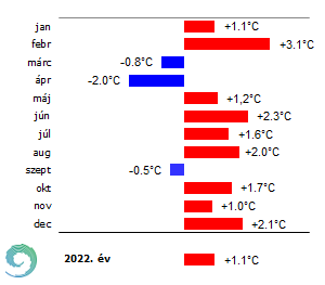 2022-ben három olyan hónap volt, amikor az 1991-2020-as sokévi átlagnál alacsonyabb volt a középhőmérséklet (3. ábra). Két tavaszi hónap, a március és az április, valamint egy őszi hónap, a szeptember telt csak az átlagosnál hűvösebb idővel. A többi kilenc hónap legalább 1°C-kal melegebb volt az 1991-2020-as normálnál. A legnagyobb különbség februárban adódott (+3,1°C), míg 2°C-ot meghaladó anomáliát tapasztaltunk júniusban, augusztusban és decemberben is. A 2022-es nyár a legmelegebb volt 1901 óta, melyhez hozzájárult, hogy az augusztus a 2., míg a június a 3. helyre került az 1901-2022-es időszakot felölelő sokéves adatsorban. Az éves középhőmérséklet 11,83 °C volt, ami 1,1 °C-kal haladta meg az 1991- 2020-as normált.