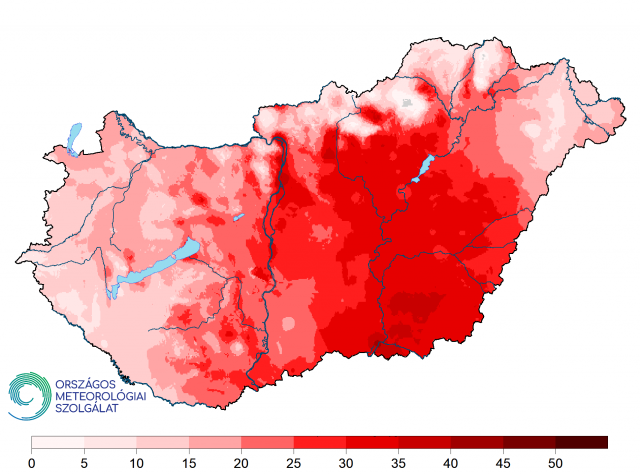 Az év fontos jellemzője az éghajlati indexek számának alakulása, például a hideg és a meleg küszöbnapok száma. Fagyos napból (Tmin ≤ 0 °C) 89 nap volt, ez 1 nappal kevesebb az 1991- 2020-as normálnál. Téli napból (Tmax ≤ 0 °C) 6 nap adódott a szokásos 24 helyett. A zord napok (Tmin ≤ -10 °C) száma mindössze 3 volt, míg a normál 8 nap. Zabar állomáson volt a legtöbb, itt 26 napot regisztráltunk. A nyári napok száma (Tmax ≥ 25 °C) 103 volt, ami jelentősen - több mint két héttel - haladta meg az 1991-2020-as átlagot (87 nap). A hőhullámos napok (Ta ≥ 25 °C) területi eloszlását mutató 10. ábra szerint 2022 nyarán az Alföld jelentős részén 30-35 hőhullámos nap fordult elő, és még ennél is több (35-40 nap) adódott CsongrádCsanád vármegyében. 2022-ben hőségnapból (Tmax ≥ 30 °C) a normálnál (29 nap) jóval többet, összesen 48 napot jegyeztünk. Kübekháza gátőrház állomáson volt a legtöbb, összesen 14 79 hőségnap jelentkezett. A forró napok száma (Tmax ≥ 35 °C) országos átlagban 8 nappal több volt, mint az 1991-2020-as átlag (3 nap).