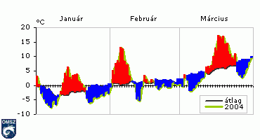 is hidegebb volt a megszokottnál, azonban ebben a hónapban is elõfordult egy az átlagosnál lényegesen melegebb periódus (március 18-19-én 1-2 hegyi állomást kivéve, az egész ország területén 20-25 fokig emelkedett a nappali csúcshõmérséklet).