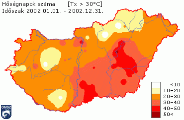 A 2002. év hőmérsékleti viszonyainak jellemzésére megnéztük a hőmérsékleti küszöbnapok elõfordulásait is. Az év során átlagosan 24 téli napot (Tmax <= 0°C) regisztráltak, ez a sokéves átlag alatt maradt. Az elmúlt évben átlagosan 95 napon süllyedt a hőmérő higanyszála fagypont alá az ország területén, ami közelítõleg megegyezik a sokéves országos átlaggal. Nyári nap (Tmax >= 25°C) átlagosan 79 fordult elõ, ami több a szokásosnál. Hőségnapot (Tmax >= 30°C) átlagosan 25-öt regisztráltak, ebből 15 szokott elõfordulni évente. Tavaly átlag 2 forró napunk (Tmax >= 35°C) volt, ezek évi száma az 1961-90-es idõszak alatt nem érte el az 1 napot.