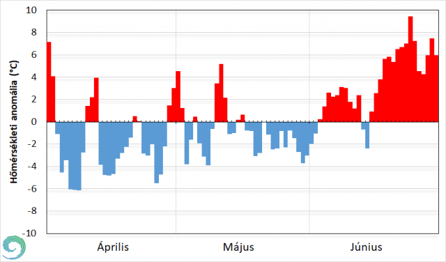 Június első napjaiban még a sokévi átlag alatt maradtak a napi középhőmérsékletek. Ezt követően hosszú ideig a normál felett alakult a hőmérséklet. 13-15-e közt ismét hűvösebb volt időjárásunk, főképp a hajnali órákban, majd a hónap hátralevő részében végig pozitív anomália volt jellemző. Annyira megemelkedett a napi középhőmérséklet, hogy a hónap második felében egymást érték a hőségriasztások. A Kárpát-medence térsége tartósan a Nyugat-Európa fölött örvénylő ciklonok ún. előoldali áramlási rendszerében helyezkedett el. Ezzel az áramlással déli, délnyugati irányból több alkalommal igen meleg, afrikai eredetű légtömeg érkezett térségünk fölé. Június 23-án és 24-én is új országos napi rekord született. Előbbi napon Berettyóújfalu és Dombegyház állomáson is 37,8 °C-ig emelkedett a hőmérséklet, míg 24-én 40,0 °C-kal tetőzött a hőség Fülöpházán.