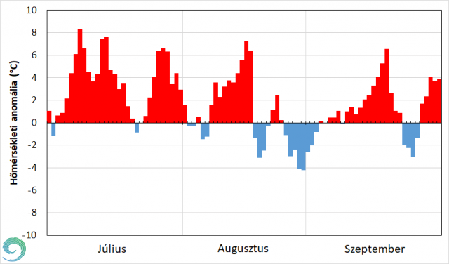 A hónap elején egy anticiklonnak köszönhetően nyugodt, szinte eseménytelen időjárás uralkodott a Kárpát-medencében. A csendes, kora őszi időnek megfelelően a napi átlaghőmérséklet a sokévi átlag közelében mozgott, majd a második dekád elejétől elkezdett fokozatosan emelkedni, így a hónap közepén már 4-6 °C-kal többet mértünk az ilyenkor megszokottnál. Ezt követően egy északnyugat felől érkező hullámzó hidegfront hatására hűvösebbre fordult az idő, az átvonuló front mögött a megélénkülő széllel több fokkal hidegebb levegő áramlott a Kárpát-medencébe. A következő napokban újabb ciklonok vonultak át hazánk fölött. Az északias áramlás következtében érkezett hideg levegő miatt a harmadik dekád elején a napi átlaghőmérséklet 2-3 °C-kal a sokéves átlag alatt maradt. Ezt követően fokozatosan megerősödött a nappali felmelegedés, visszatért a nyáriasan meleg idő. A hónap végéig a normál felett maradt az átlaghőmérséklet (6. ábra).