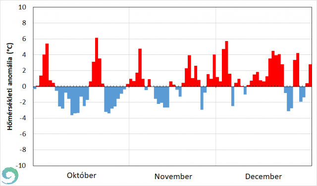 Decemberben a havi középhőmérséklet 1°C-kal magasabb volt a szokásosnál, ezért a napi átlaghőmérsékletek országos átlagai is a sokévi érték felett mozogtak a hónap nagyobb részében. A hónap a szokásosnál melegebb napokkal kezdődött, egy ciklon melegszektora határozta meg az időjárást. Ehhez hasonló, az átlagnál 3-4 °C -kal magasabb hőmérsékleteket a hónap közepén is mértünk. Ekkor a Kárpát-medence időjárását elsősorban egy nyugat-európai anticiklon alakította, nyugodt, csendes időt hozva. A következő napokban egy nagy kiterjedésű, oroszországi központú ciklon hatására sarkvidéki eredetű, hideg és száraz levegő áramlott hazánk fölé. Karácsonykor, 24-én és 25-én időjárásunkat egy melegfront alakította, a szokásosnál melegebb napokat okozva. Ezt követően kisebb mértékű lehűlés következett, de 28-tól kezdve a nappali hőmérséklet fokozatosan emelkedett. (7. ábra).