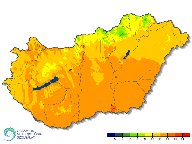 A 2021-es év során az évi középhőmérséklet területi eloszlása leginkább a domborzat hatását tükrözte. Az ország legnagyobb részét, így az alföldi tájainkat is 10-12 °C közötti értékek jellemezték (8. ábra), míg Szeged, Budapest és Pécs környékén 12 °C fölé emelkedett az évi középhőmérséklet. A Dunántúli-középhegységben 9-11 °C, míg az Északi-középhegységben jobbára 8-10 °C volt jellemző. A Mátra, a Bükk és a Zempléni-hegység legmagasabban fekvő régióiban az évi átlag 7 °C alatt maradt.