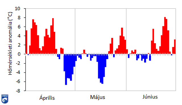 Az ország nagy részén 11-12 °C között alakult a havi átlaghőmérséklet. A déli területeken ettől enyhébb, míg a magasabban fekvő területeken hűvösebb időjárás volt jellemző. Homogenizált adatok szerint az országos átlag 12,5 °C, amely mintegy 1,5 °C-kal magasabb, mint a sokévi átlag. A Kisalföld térségében és az Ipoly mentén 0,5 °C-kal, az ország keleti határszélén 2,5-3 °C-kal haladta meg az anomália értéke a sokéves átlagot. Április első felében a napi középhőmérséklet értékek zömmel a sokéves átlag felett alakultak (5. ábra), ekkor számos rekord dőlt meg. A hónap vége felé azonban több napon keresztül az átlagosnál jóval alacsonyabb hőmérsékleti értékek jelentkeztek. Április 21-én a Nyírségben, a Kiskunságban és észak-magyarországi tájakon mértünk jelentős fagypont alatti hőmérsékleti értékeket. Április végén a Dunántúlon pusztított a fagy.
