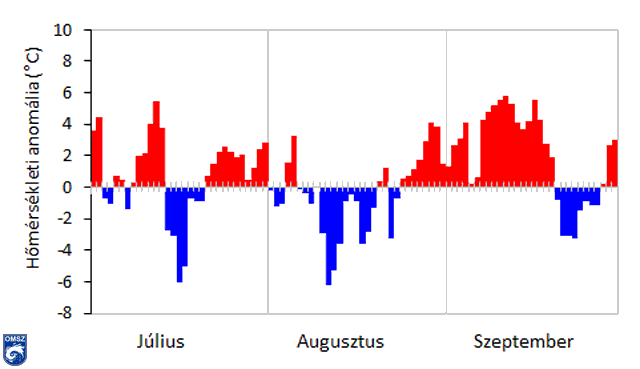 A havi országos átlaghőmérséklet 17,8 °C volt, ami több, mint 2 °C-kal magasabb a sokéves átlagnál. Az 1981-2010-es normálhoz képest negatív hőmérsékleti anomália értékek sehol nem fordultak elő az országban. A Mátra, a Bükk, a Börzsöny, valamint a Bakony és Budapest egyes területein az anomália értéke meghaladta a 3°C-t, míg a legkisebb különbség a Dráva-sík mentén és a Duna-Tisza köze déli részein jelentkezett. Szeptemberben az ország túlnyomó részén 16-17 °C-os középhőmérsékletet mértünk. Átlag feletti napi hőmérsékleti értékek jellemezték a szeptember jelentős részét (6. ábra). A hónap eleji, több napig fennálló anticiklont 4-én egy markáns hidegfront szakította meg. Ezt követően ismét anticiklon épült ki hazánk felett, amely csendes, nyugodt, napsütéses, száraz időjárással párosult. Szeptember utolsó harmadában jelentősen lehűlt a levegő, és megjelentek az első talaj menti fagyok.
