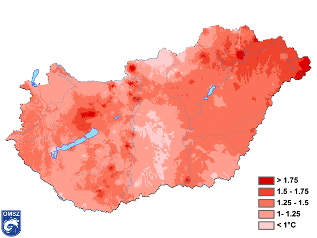 A hőmérsékleti anomália túlnyomóan +1.2 – 1.7 °C között alakult 2015-ben. Az ország ÉK-i, K-i részén láthatóak a legmagasabb értékek (9. ábra), a határszélen 1.9 °C-nál is magasabb volt az eltérés mértéke. A megszokottnál hidegebb sehol sem volt éves átlagban, a legalacsonyabb értékek a D-i, DNy-i országrészben voltak jellemzőek, de ezek is meghaladták az 1 °C-ot.