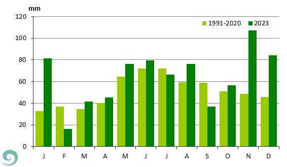 2023-ban az országos évi csapadékösszeg 767,3 mm volt, mely az 1991-2020-as sokévi átlag 125%-a (8. ábra). A megelőző két év (2022 és 2021) a legszárazabb évek első negyedébe esett, míg a 2023-as a 8. legcsapadékosabb év lett 1901 óta. Januárban a megszokott csapadékösszeg két és félszerese hullott, ezzel a legcsapadékosabb január lett az elmúlt 123 évben. Februárban a normál érték 44%-a hullott csak le, így szárazság szempontjából a februárok szárazabb harmadába tartozik. A csapadékösszeg mind a három tavaszi hónapban 10-20%-kal haladta meg az 1991-2020-as átlagot. Ezt követően júniusban is az átlag felett, júliusban viszont az átlag alatt alakult a havi összeg. Augusztusban közel 30%-kal hullott több csapadék a normálnál, ezzel a 29. legcsapadékosabb lett a 123 éves adatsorunkban. A szeptember már szárazabban telt, a megszokott mennyiség 63%-a érkezett, októberben pedig 11%-kal haladta meg a csapadék az átlagot. Novemberben már az éghajlati normálnak több, mint kétszerszere hullott, és decemberben is a szokásos érték 184%-a adódott. Ennek köszönhetően a november a 8. míg a december a 10. legcsapadékosabb lett 1901 óta. Az év legnagyobb napi csapadékösszege 122,0 mm volt, amit június 6-án Kékestető állomáson regisztráltunk.