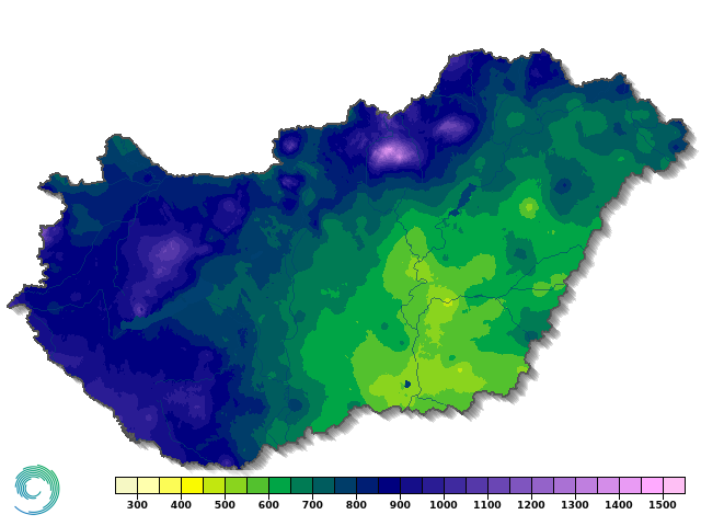 2023-ban a hegyvidékeken hullott a legtöbb csapadék, ami mellett egy nyugat-kelet irányú csökkenés is megfigyelhető (9. ábra). A legalacsonyabb, 500-650 mm közötti értékek az Alföld középső részén voltak jellemzőek, míg a Dunántúlon általában 700-900 mm között volt a csapadék éves összege. A Dunántúli-középhegységben többnyire 900-1100 mm, míg az Északi-középhegységben 900-1200 mm volt jellemző. A legmagasabb évi összeget (1406,6 mm) Kékestetőn mértük, míg a legkisebb éves értéket (467,3mm) Békéssámson állomáson jegyeztük.