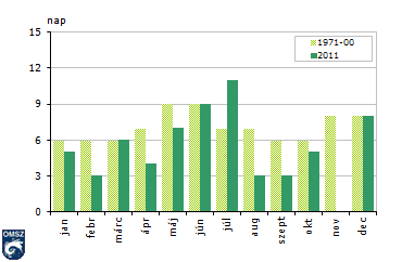 Az 1 mm-nél nagyobb csapadékú napok száma is júliusban volt maximális (15. ábra), viszont a csapadékos napokhoz képest a december kevésbé képviselt kiugró értéket. A fentiekkel összhangban, novemberben nem jelent meg oszlop a grafikonon, jelezve, hogy 2011 novemberében országos átlagban nem volt olyan nap, amikor 1 mm-nél több csapadék hullott volna.