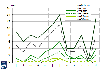 A csapadékos küszöbnapok is a szokásosnál szárazabb időjárásról tanúskodnak, minden határérték esetén kevesebb napot számláltunk az 1971-2000-es átlaghoz képest. Országos átlagban mindössze 93 napon regisztráltunk csapadékot (r≥0,1 mm), ami 22-vel kevesebb a szokásosnál. A 14. ábrán a legszembetűnőbb a szélsőségesen száraz november mélypontja, amikor országos átlagban egyetlen napról beszélhettünk csapadékos napként, holott általában 10 ilyen nap szokott előfordulni. Kitűnik továbbá a július és a december maximuma. Mindkét hónap értéke átlagon felülinek számított, júliusban a 9 helyett 14, decemberben a 11 helyett 13 csapadékos napot számoltunk.