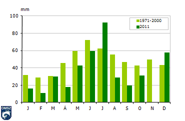 A 13. ábrára tekintve a júliusi kimagasló érték tűnik ki elsőnek. Ebben a hónapban 92.5 mm csapadékot regisztráltunk országos átlagban, mellyel az év legcsapadékosabb hónapja lett, megelőzve ezzel a júniust, melynél a sokéves átlag tükrében minden hónap szárazabb szokott lenni. Általában február szokott a csapadékban legszegényebb lenni az évben, 2011-ben viszont a november, szinte teljesen csapadékmenetes időjárása minden hónapot alulmúlt. Ezenkívül az átlagos menet szempontjából szokatlan visszaesést mutattak az április, illetve az augusztus-szeptember hónapok.