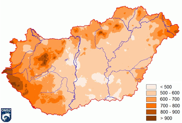 Az éves csapadékösszeg területi eloszlását tekintve (12. ábra) a legtöbb csapadék középhegységeinkben, illetve az Alpokalján hullott, míg a legszárazabbnak az Alföld bizonyult. Ez az elrendezõdés jól megfelel a szokásos képnek, és a jellemzõ értékek is a sokéves átlag közelében voltak, az interpolált adatok alapján az csapadékösszegek általában 500 és 900 mm között változtak.