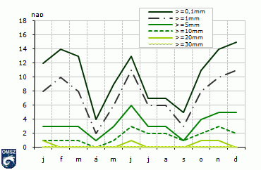 A csapadékviszonyokat a mért csapadékmennyiség mellett, a csapadékos küszöbnapok számával is jól jellemezhetjük (14. ábra).