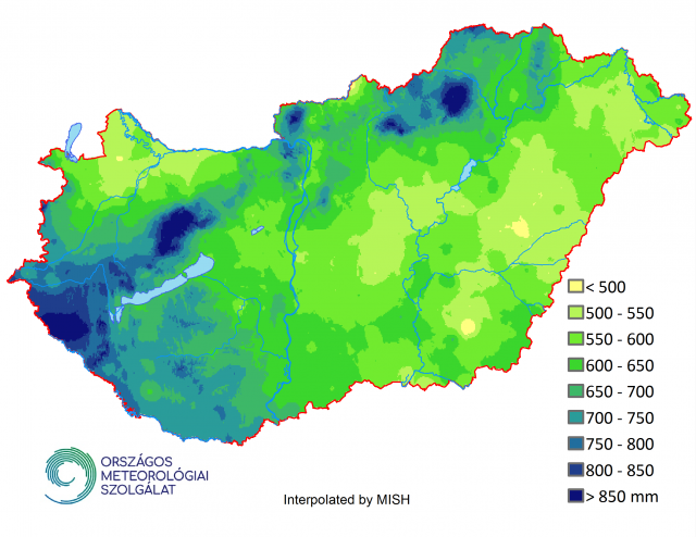 Az évi csapadékösszeg térbeli eloszlása (13. ábra) alapvetően tükrözte ebben az évben is a domborzati adottságok hatását, azonban ezúttal igen jelentős területi különbségek is adódtak a Dunántúl és a Tiszántúl között. Zala-megyében, a Bakonyban és a Bükkben jóval 850 mm feletti éves csapadékösszeg fordult elő. A legmagasabb évi csapadékösszeget (946 mm) 2019-ben Bakonybél állomáson összegeztük. A csapadékban szegény tavaszi és őszi hónapok miatt a Kisalföldön és az Alföld keleti tájain 500 mm közelében és az alatt alakult az évi csapadékmennyiség. A legalacsonyabb éves csapadékösszeget a Békés megyei Orosháza állomáson jegyeztünk, ahol mindössze 381,7 mm volt az éves mennyiség (I. táblázat).
