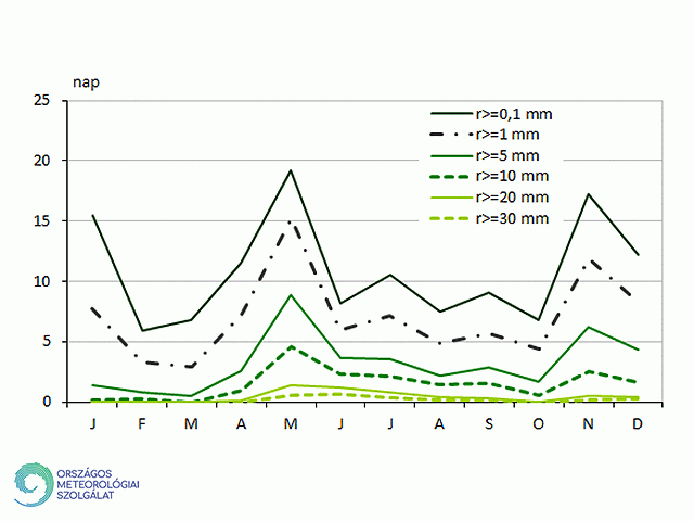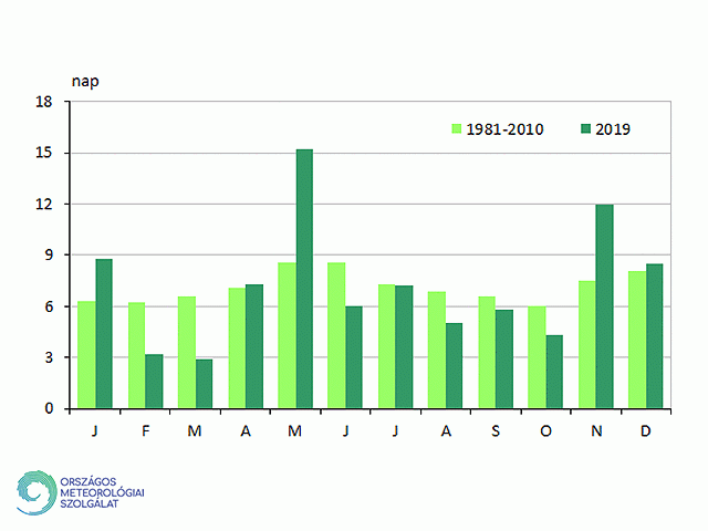 2019-ben 1 nappal kevesebbet jegyeztünk azokból a napokból, amikor a csapadék mennyisége meghaladta az 1 mm-t (normál: 86 nap; 2019: 85 nap). A szokásos éves menet (17. ábra) szerint májusban és júniusban kellett volna a legtöbb 1 mm csapadék feletti napot detektálnunk. 2019-ben januárban (8 nap), májusban (16 nap) és novemberben (12 nap) fordult elő a legtöbb ilyen nap. A 20 mm-t elérő napokból (2019: 5 nap), és a 10 mm-t elérő napokból (2019: 18 nap) közel ugyanannyi volt, mint az 1981-2010-es átlag. Havas napból lényegesen kevesebb fordult elő a vártnál országos átlagban: 24 helyett 16 nap. A legtöbb havas napot 2019-ben Kékestető állomáson összegeztük (60 nap).