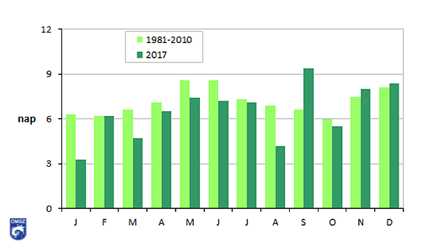 A csapadék éven belüli eloszlásának megváltozását a 15. ábrán mutatjuk be. Hazánkban a sokévi átlagok alapján a legszárazabb hónapok általában a január és február. A nyár elején, júniusban szokott a legtöbb csapadék hullani (elsődleges csapadékmaximum), majd az októberi kicsit szárazabb időszak után novemberben egy második csapadékmaximum azonosítható, bár mértéke sokéves átlagban is csökken. 2017-ben a tél végén február kicsit csapadékosabb volt, míg a tavaszi hónapok csapadékmennyisége elmaradt a sokévi átlagtól, különösen márciusban. A legcsapadékosabbnak várt június mellett az összes nyári hónap szárazabb volt, és szeptemberre érkezett meg a jelentősebb csapadék. Az őszre várt másodlagos csapadékmaximumot ezúttal decemberben figyelhettük meg.