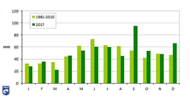 2017 márciusa a szokásosnál szárazabb volt, az országos átlag 22,2 mm, ami az 1981-2010-es sokévi átlag csupán 64 %-a. A csapadék leginkább a középső országrészre koncentrálódott, 40-50 mm feletti értékeket eredményezve. Gerecse-tetőn regisztráltuk a legnagyobb havi összeget, 64 mm-rel. Az ország északkeleti és nyugati részein jelentkezett a legkisebb csapadékösszeg, az Őrség egyes részein 5 mm alatti értéket mértünk.