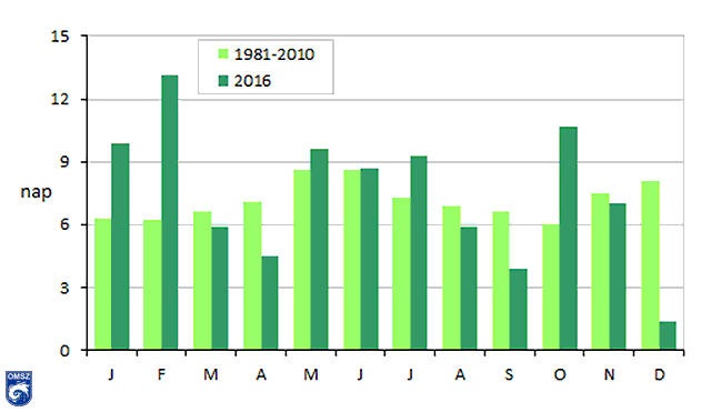 2016-ban 4 nappal többet jegyeztünk a megszokottnál (normál: 86 nap; 2016: 90 nap) azokból a napokból, amikor a csapadék mennyisége meghaladta az 1 mm-t. A szokásos éves menet (17. ábra) szerint májusban és júniusban kellett volna a legtöbb 1 mm csapadék feletti napot detektálnunk, de 2016-ban február, október és január megelőzte ezeket a hónapokat. A 20 mm-t elérő napokból is kettővel több (normál: 5 nap; 2016: 7 nap), míg a 10 mm-t elérő napokból néggyel több adódott (normál: 19 nap, 2016: 23 nap). Havas napból jelentősen kevesebb fordult elő a vártnál: 24 helyett mindössze 13 nap.