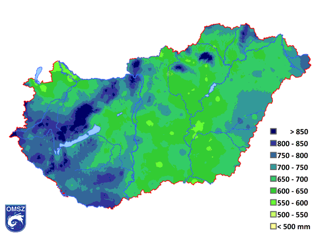 Az éves átlagos csapadékösszeg térbeli eloszlása megfelel a medence helyzetnek, és követi a domborzati viszonyokat (13. ábra). Az ország alföldi tájain, a medence belsejében 550–700 mm között alakult az éves csapadékmennyiség. A Dunántúli-középhegységben és a délnyugati határszélen 850 mm feletti értékek is előfordultak. A legmagasabb éves csapadékösszeget (1020 mm) 2016-ban a Bükkben, Jávorkúton összegeztük. A legalacsonyabb éves csapadékösszeget a Mosoni-Duna mentén, a Sajó völgyében és a Közép-Tisza vidéken jegyeztünk, de ezeken a tájakon is 500 mm fölött alakult a csapadék mennyisége.