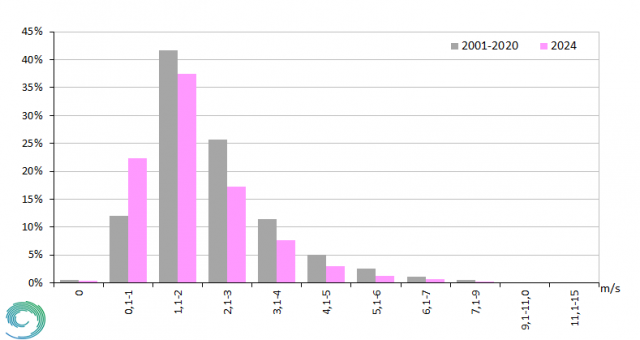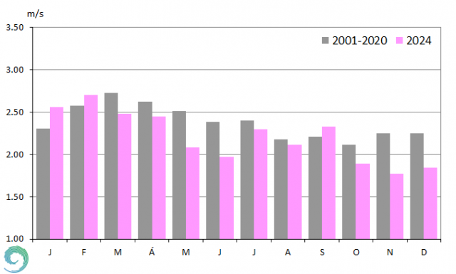 A szélsebesség évi átlaga hazánk területén többnyire 1,5 és 3,5 m/s között változott, az országos átlag 2001-2020 között 2,6 m/s volt, míg 2024-ban 2,4 m/s-nak adódott. A legmagasabb évi átlagok a Dunántúl északi részén és a Tiszántúlon voltak jellemzőek, ahol nagyobb összefüggő területen a szélsebesség elérte a 3 m/s-ot. A Dunántúli-középhegység magasabban fekvő csúcsai esetén előfordultak 4 m/s-ot meghaladó értékek is. A szélsebesség átlagos éves menetét jól mutatják a szürke oszlopok a 14. ábrán. Január elejétől márciusig növekszik az országos átlag, majd augusztusig csökken, és újra növekedni kezd egészen az év végéig. 2024-ben az országos szélsebességek havi átlagai januárban, februárban és szeptemberben haladták meg a sokévi átlagot. Márciustól egészen augusztusig és októbertől az év végéig a havi szélsebesség értékek elmaradtak az átlagtól, a legnagyobb eltérés május, június majd november, december hónapokban volt jellemző. A legalacsonyabb átlagos szélsebesség novemberben volt (~1,77 m/s), amit a december (~1,84 m/s) és a június (~1,89 m/s) követett. A legjelentősebb pozitív eltérés januárban adódott, míg a legszelesebb hónap a február volt (>2,7 m/s).