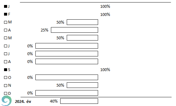 Viharos napból (fx ≥ 15 m/s) egy év alatt 30 szokott lenni az 1991-2020-as átlag szerint, ehhez képest 2024-ben mindössze 12 viharos napot detektáltunk Pestszentlőrincen, tehát 60%-kal kevesebb ilyen nap jelentkezett. Csupán januárban, februárban és szeptemberben érte el a viharos napok száma a normál értéket, és egyik hónapban sem haladta meg azt. A nyári hónapokban, továbbá októberben és decemberben egyetlen viharos nap sem fordult elő, míg áprilisban, májusban, szeptemberben, októberben és novemberben is csak 1-1 ilyen nap jelentkezett.