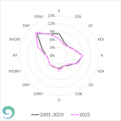 A 20. ábrán a szélirány gyakorisági eloszlását láthatjuk Budapest Pestszentlőrincen a 2001-2020. közötti időszak átlaga és a 2025. év adatai alapján. A sokévi átlag jól mutatja, hogy Budapest esetén az uralkodó szélirány egyértelműen az északnyugati, de a keleti is nagy gyakorisággal fordult elő. 2025-ben nagyon sok helyen együtt fut a két görbe, a sokéves átlagnak megfelelően dominált az északnyugati irány, ezt követte a keleti. Az észak-északnyugati és nyugat-északnyugati alig tért el egymástól, tehát az utóbbi ebben az évben nagyobb arányban képviseltette magát. Az északi irányú szél a sokéves átlagnál kisebb arányban fordult elő 2025-ben.
