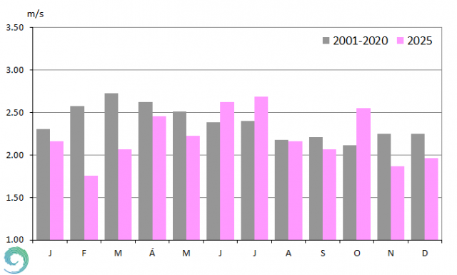 A szélsebesség évi átlaga hazánk területén többnyire 1,5 és 3,0 m/s között változott, az országos átlag 2001-2020 között 2,6 m/s volt, míg 2025-ben 2,3 m/s-nak adódott. A legmagasabb évi átlagok a Dunántúl északi részén és a Tiszántúlon voltak jellemzőek, ahol nagyobb összefüggő területen a szélsebesség meghaladta a 3 m/s-ot. A Dunántúli-középhegység magasabban fekvő csúcsai esetén előfordultak 4 m/s-ot meghaladó értékek is. A szélsebesség átlagos éves menetét jól mutatják a szürke oszlopok a 14. ábrán. Január elejétől márciusig növekszik az 2001-2020-as átlag, majd augusztusig csökken, és újra növekedni kezd egészen az év végéig. 2025-ben a Budapest Pestszentlőrincen mért szélsebességek havi átlagai júniusban (~2,62 m/s), júliusban (~2,69 m/s) és októberben (~2,55 m/s) haladták meg a sokévi átlagot. Februárban (~1,76 m/s) és márciusban (~2,07 m/s) a havi szélsebesség értékek jelentősen elmaradtak az átlagtól, említésre méltó negatív eltérés még az év utolsó két hónapjában jelentkezett.