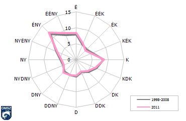 A 22. ábrán a szélirány gyakorisági eloszlását láthatjuk Budapest-Pestszentlőrinc 1998-2008 és 2011. évi adatai alapján. Az átlag jól mutatja, hogy Budapest esetében érvényre jut az Atlanti-óceán és a Földközi-tenger felől érkező ciklonok által meghatározott északnyugati szélirány. A keleties szélirány hangsúlyosabb megjelenésének oka a városi hősziget jelensége, valamint a Duna és a Pesti-síkság közötti helyi légkörzés egymást erősítő hatásában keresendő. A 2011-es viszonyok nem mutatattak nagy különbséget a fentiekhez képest, az értékek jól követték az átlagot.