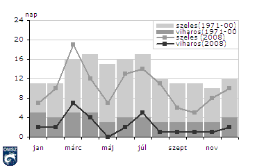 2008-ban Budapest-Pestszentlõrinc állomáson a 0,1-1, 2,1-3 és 4.1-5 m/s-os szélsebességek az átlagnál többször, 3,1-4,0 m/s-os, értékek átlag alatti számban, a többi szélsebesség pedig átlag körüli mértékben fordult elõ. 2008-ban egy hónap kivételével átlag alatt maradt a szeles (>=10m/s) napok száma, míg a viharos (>=15 m/s) napok száma két hónapban volt magasabb a sokévi átlagnál (19 - 21. ábra).