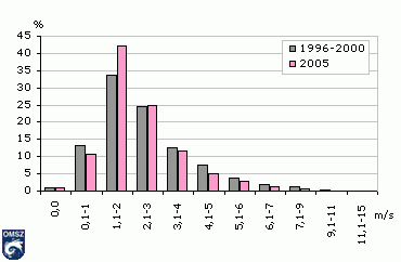 2005-ben (19. ábra) az 1,1-2,0 m/s-os (leggyakoribb) sebességek az ötévi átlagnál többször, a 2,1-3,0 m/s-os értékek átlag körüli mértékben, a többi szélsebesség átlag alatti számban fordultak elõ. Kevesebbszer mértek tehát 2005-ben 1 m/s-nál gyengébb szelet, de a szeles- (>=10m/s) és a viharos (>=15 m/s) napok száma is többnyire átlag alatt maradt (20. és 21. ábra).