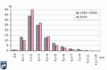 2004-ben (18. ábra) az 1,1-2,0 m/s-os leggyakoribb- és a 2,1-3,0 m/s-os illetve 3,1-4,0 m/s-os értékköz az ötévi átlagénál is többször fordult elõ. Kevesebbszer mértek viszont 2004-ben 1 m/s-nál gyengébb szelet. A szeles- (>=10m/s) és a viharos (>=15 m/s) napok száma többnyire átlag alatt maradt (19. ábra).
