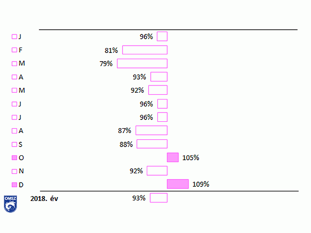 A 19. ábrán jól látható, hogy 2018 októberéig a szélsebesség havi átlagértékei többé-kevésbé elmaradnak az 1981-2010-es sokévi átlagtól. Különösen február és március volt a legkevésbé szeles Budapesten. Áprilistól októberig a legtöbb hónap légmozgása a sokévi áltagnak megfelelően alakult. A legnagyobb pozitív eltérés októberben és decemberben mutatkozott meg: októberben 5 %-kal, decemberben 9 %-kal volt nagyobb a szélsebesség a szokásosnál. Összességében elmondható, hogy Budapest Pestszentlőrinc állomáson az átlagos évi szélsebesség 2018. évben a sokévi átlagtól kissé elmaradt (93%).